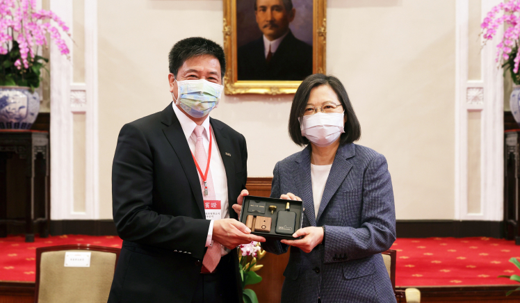 友達在「國家企業環保獎」中獲雙項「金級獎」肯定,董事長彭雙浪(左)代表接受總統蔡英文表揚